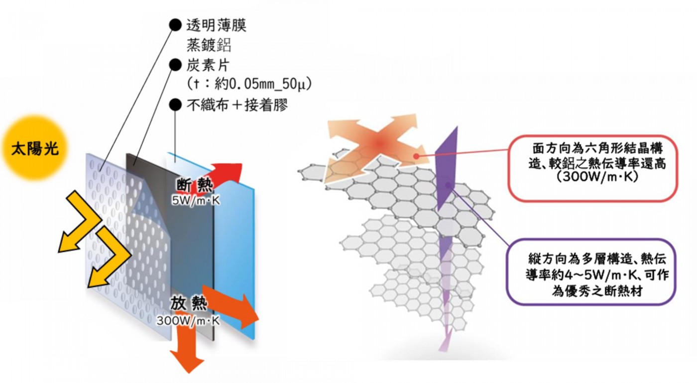 碳素節能隔熱片亦可貼於車廂外頂部,其夾層炭素純度99.9%之炭素片(50μ),表面蒸鍍鋁可反射太陽光並迅速散熱,同時炭素片其縱向僅導熱僅5W/m・K,斷熱效果非常高,横面向具備 300W/m・K之高散熱效果,可達到同時隔熱及防水的雙重效果。